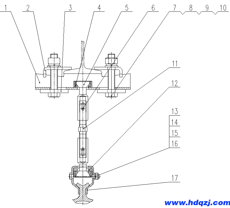 1.上吊掛座、2.壓板、3.墊板、4.半球座、5.吊桿、6.開口銷?3X45、7.彈簧墊圈 16、8.螺栓M16×90-8.8、9.平墊圈 16、10.螺母M16、11.雙頭螺栓、12.下吊掛座、13.彈簧墊圈 8、14.螺栓M8×65-8.8、15.平墊圈 8、16.螺母M8、17、夾片